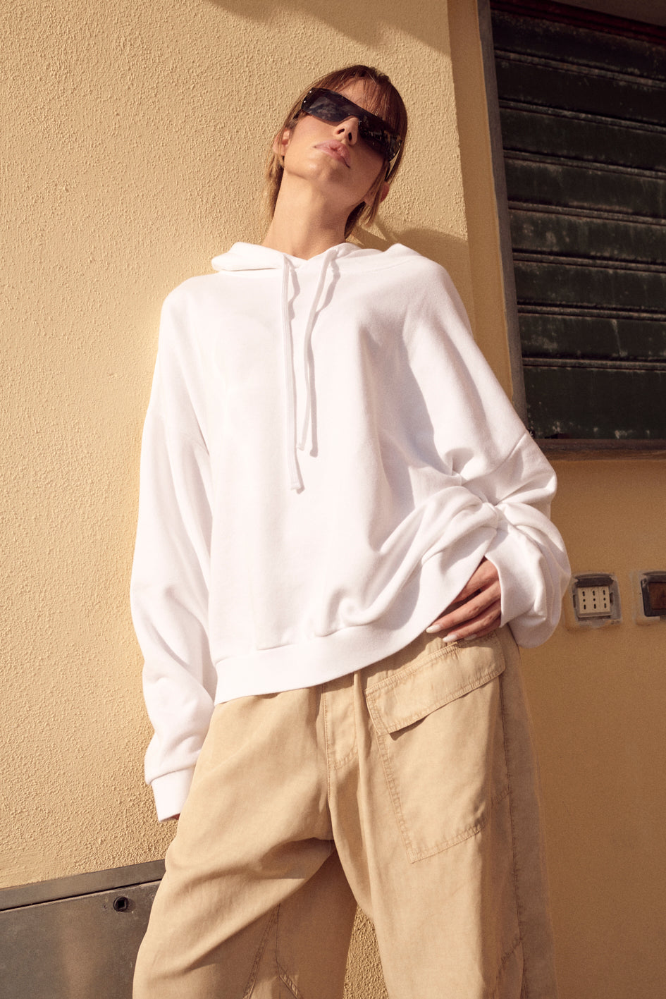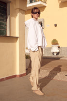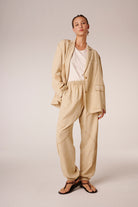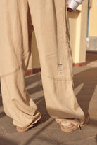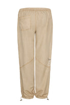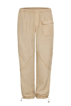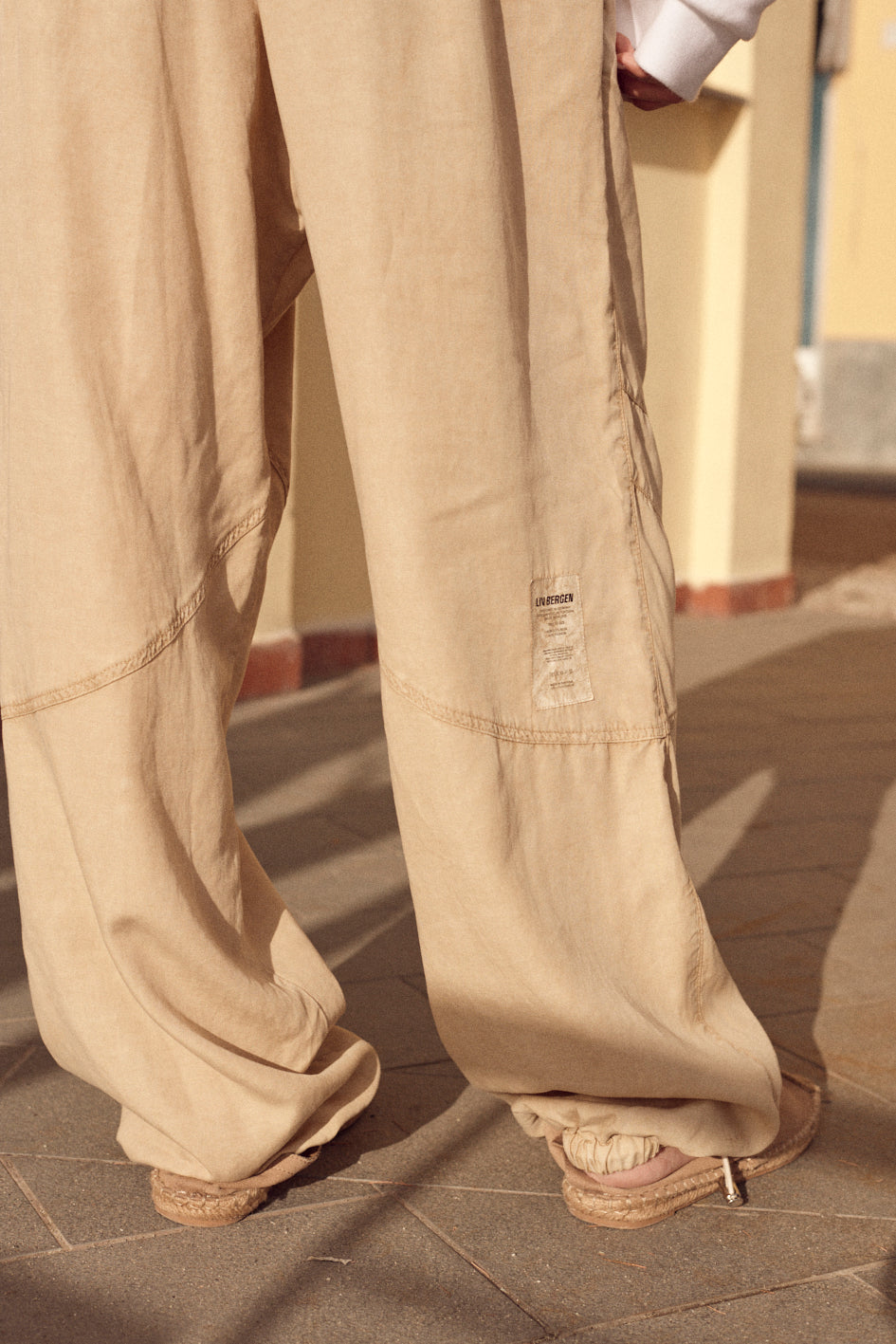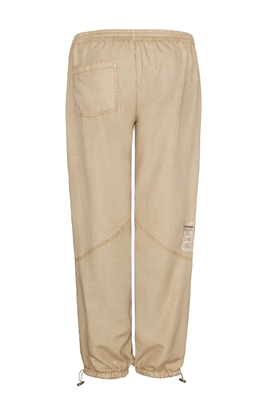 Die Hose hat einen zarten Farbton und eine lässige Passform. Der elastischen Bund an der Taille, sowie Gummizüge an den Beinabschlüssen, sorgen für einen hohen Tragekomfort. Der weiche, dünne Stoff fällt fließend.