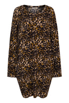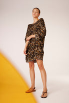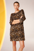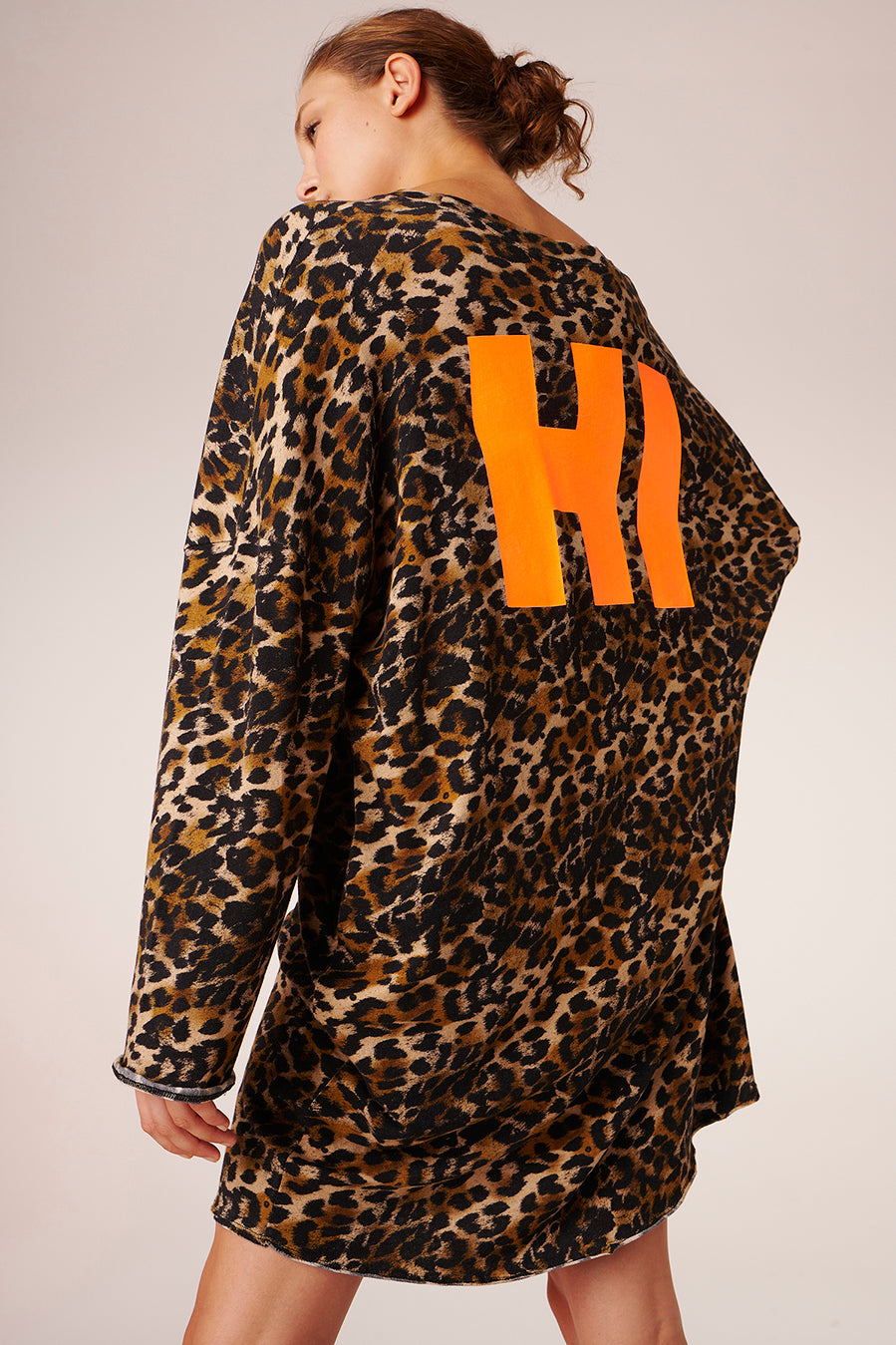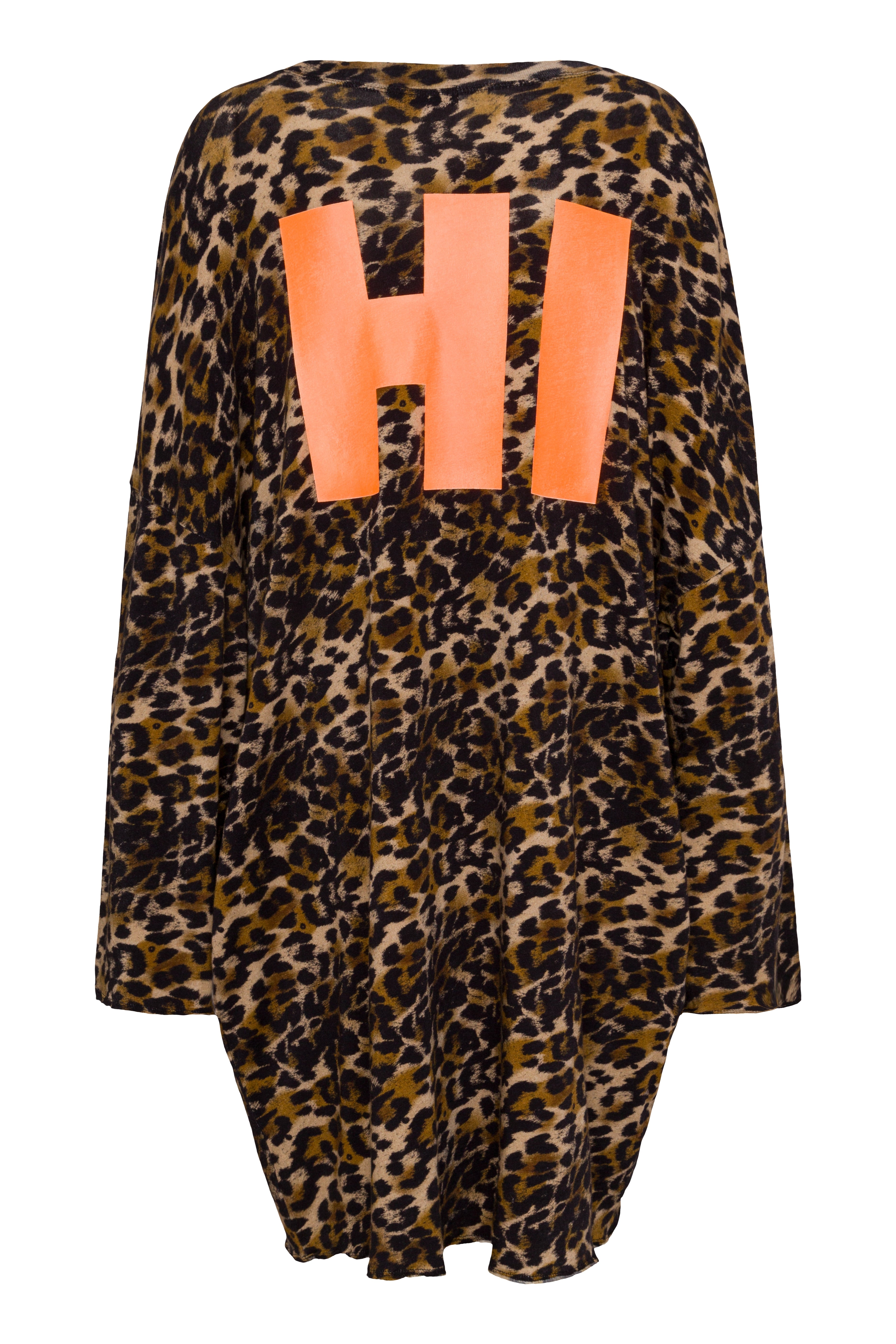 Das Kleid ist leicht und luftig gestaltet, mit einem etwas größeren Ausschnitt und praktischen Taschen an den Seiten. Als Kontrast zum Leo-Print ziert ein auffälliger Neon-Print mit dem Schriftzug "Hi" die Rückseite.