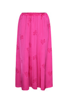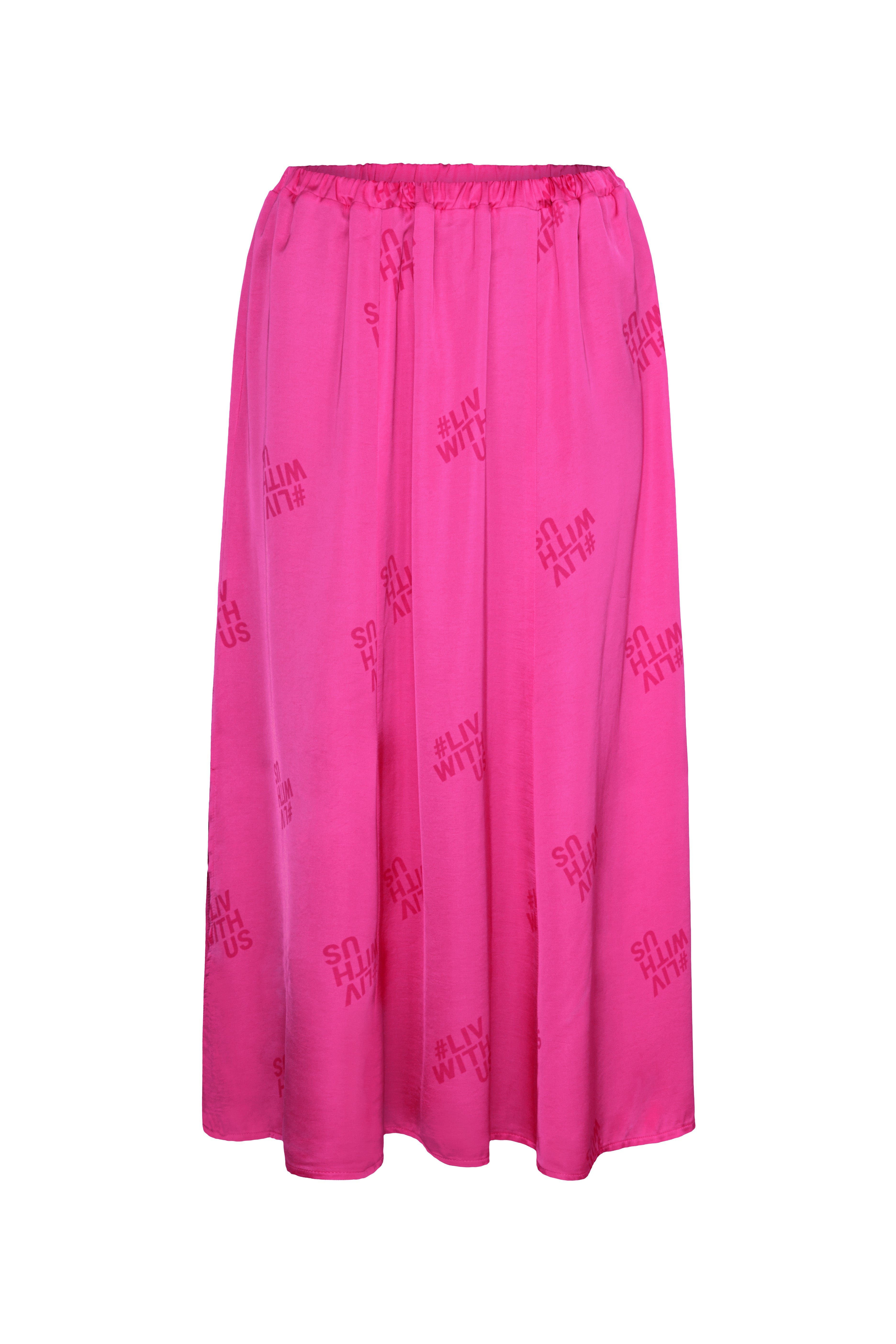Der Rock aus Rayonstoff hat eine fließende Silhouette und reicht bis über die Knie. Der elastische Bund sorgt für eine bequeme Passform. Der Stoff ist mit dem wiederholten Aufdruck "#LIV WITH US" versehen. Der Rock wirkt stilvoll und entspannt zugleich, ideal für einen sommerlichen Look.