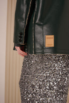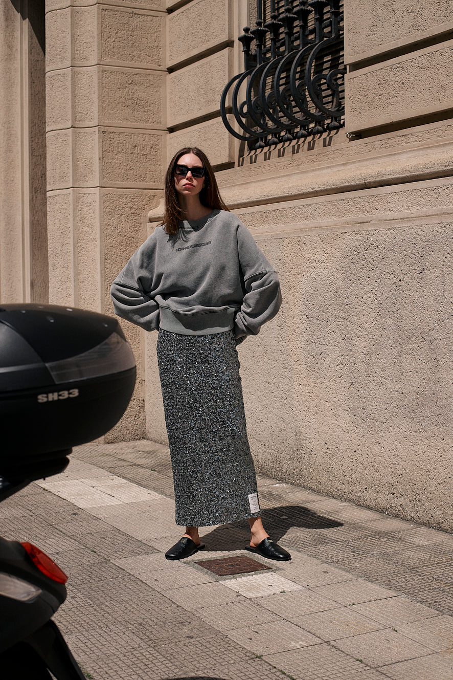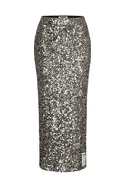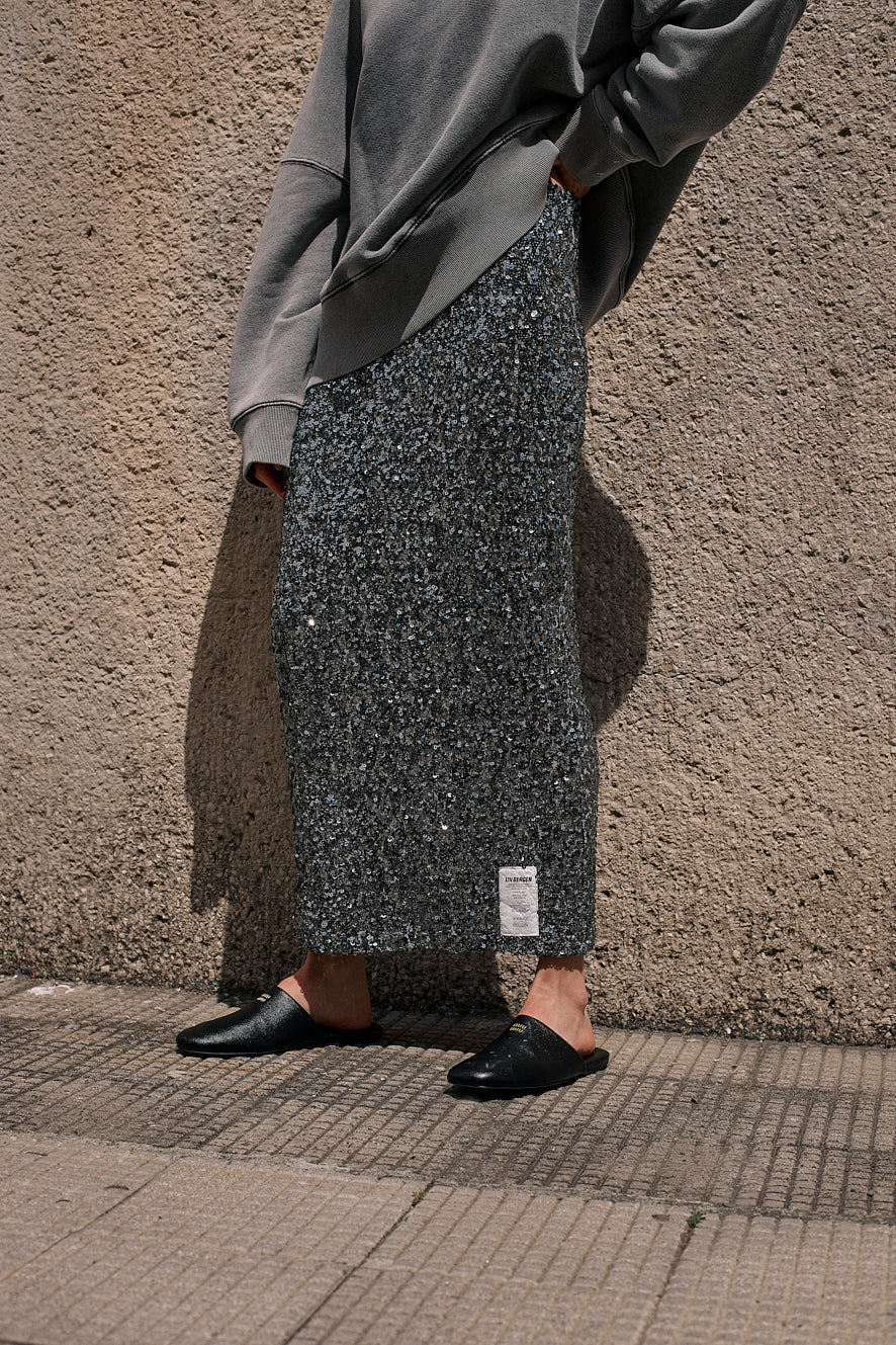 Dieser silberne Paillettenrock sorgt mit seinem funkelnden Design und dem verspielten Paper-Tag am Saum für einen charmanten Auftritt – ideal, um bei jedem Anlass zu strahlen.