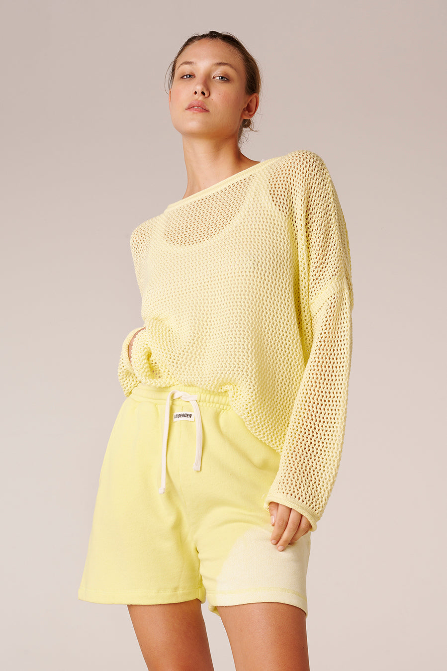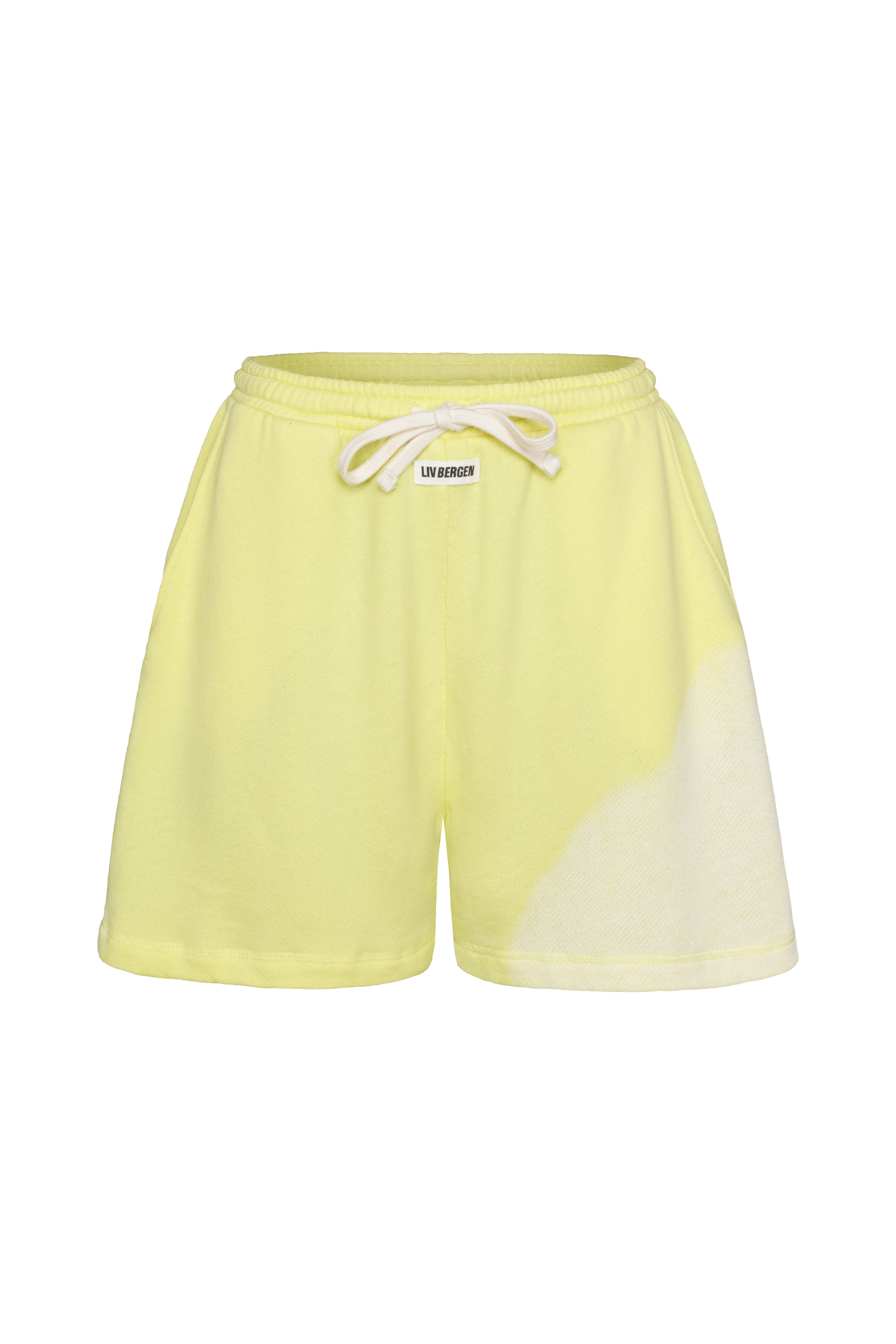 Die Shorts sind lässig geschnitten und weisen auf einer Seite einen bleached Effekt auf. Unter der Kordel befindet sich ein gewebtes Etikett.