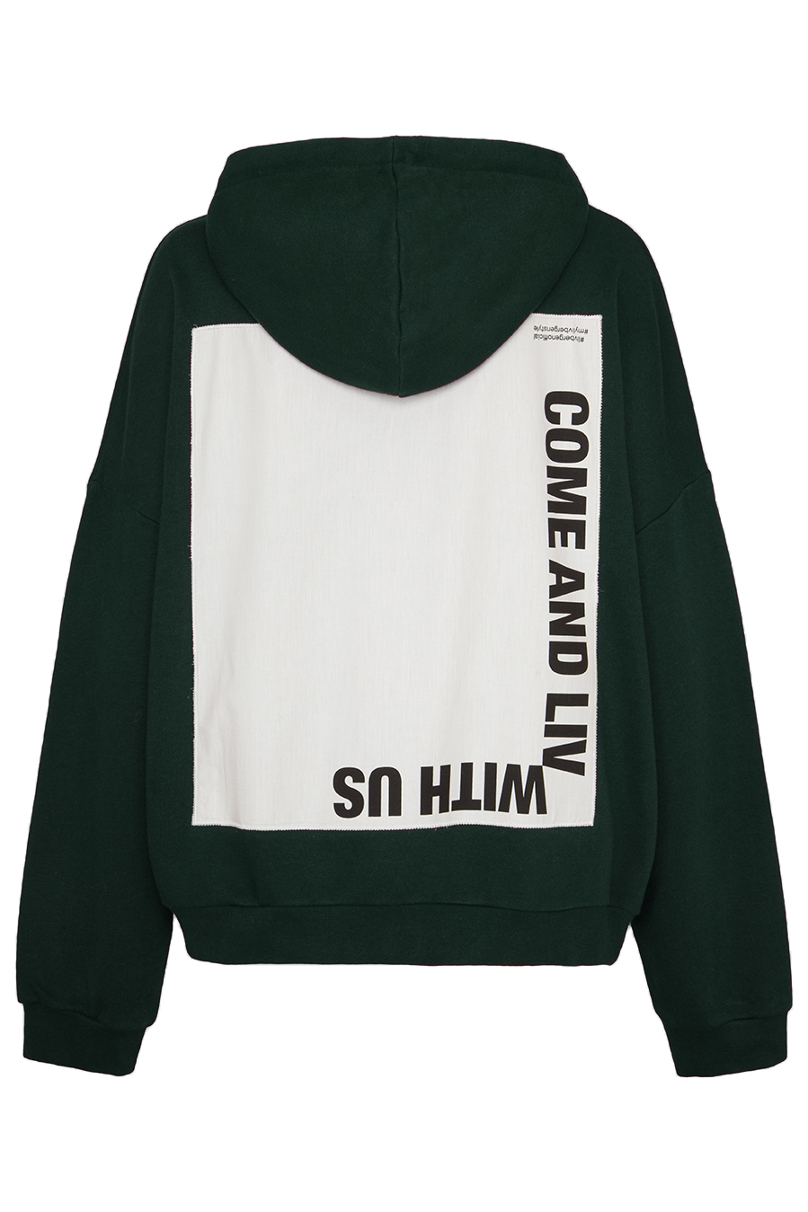 Der Hoodie überzeugt mit seinem lässig-kastigen Schnitt. Auf der Rückseite setzt der Print „Come and liv with us“, unterlegt mit einem weißen Square, ein klares visuelles Statement – simpel, stark, einprägsam.