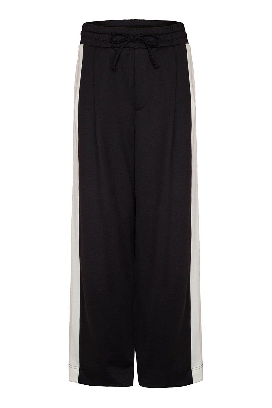 Diese Track Pants in schwarz kombiniert mit weißen Seitenstreifen und lässigen Frontfalten – für einen sportlich-coolen Look mit Komfortfaktor. Ideal für Tage, an denen du entspannt, aber trotzdem stylisch unterwegs sein willst.