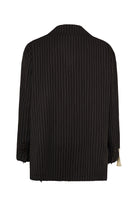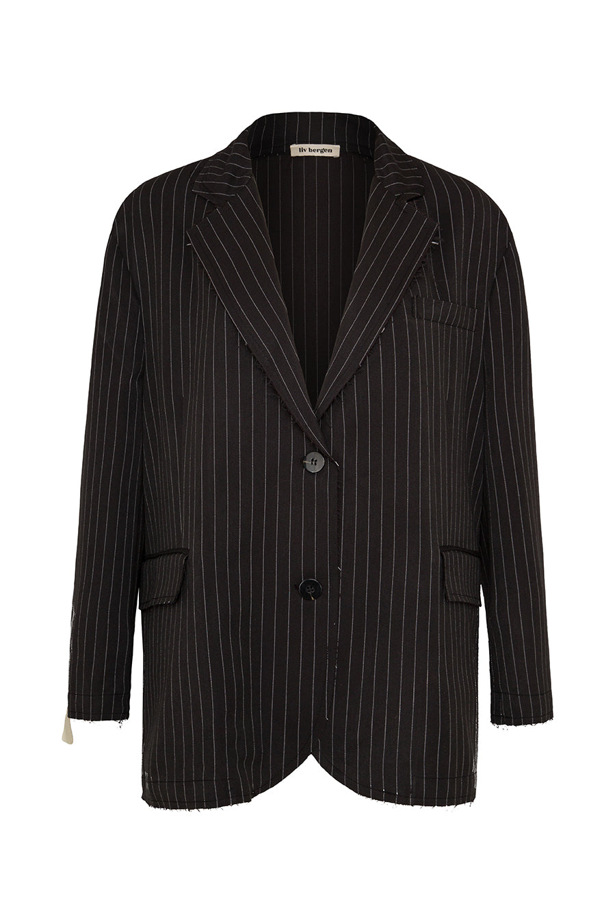 Dieser schwarze Nadelstreifen-Blazer bringt mit seinen open cut-Nähten einen moderne Edge ins Spiel. Lässiger Tailoring-Vibe, veredelt durch ein dezentes Weblabel mit Print am Ärmel – subtil, aber wirkungsvoll. Ein Statement für alle, die Stil und Individualität mühelos verbinden.
