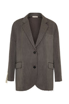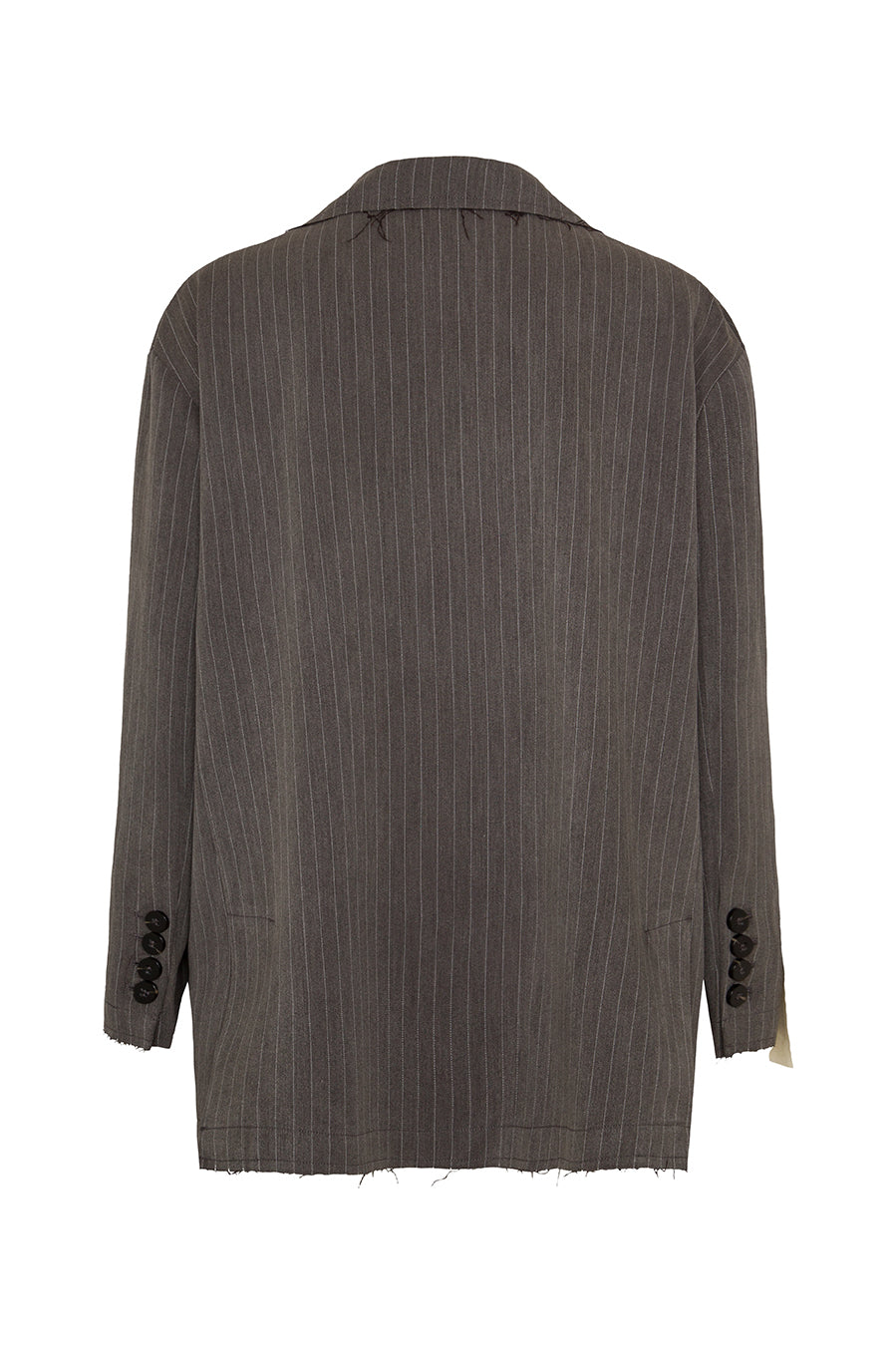 Dieser graue Nadelstreifen-Blazer bringt mit seinen open cut-Nähten einen moderne Edge ins Spiel. Lässiger Tailoring-Vibe, veredelt durch ein dezentes Weblabel mit Print am Ärmel – subtil, aber wirkungsvoll. Ein Statement für alle, die Stil und Individualität mühelos verbinden.