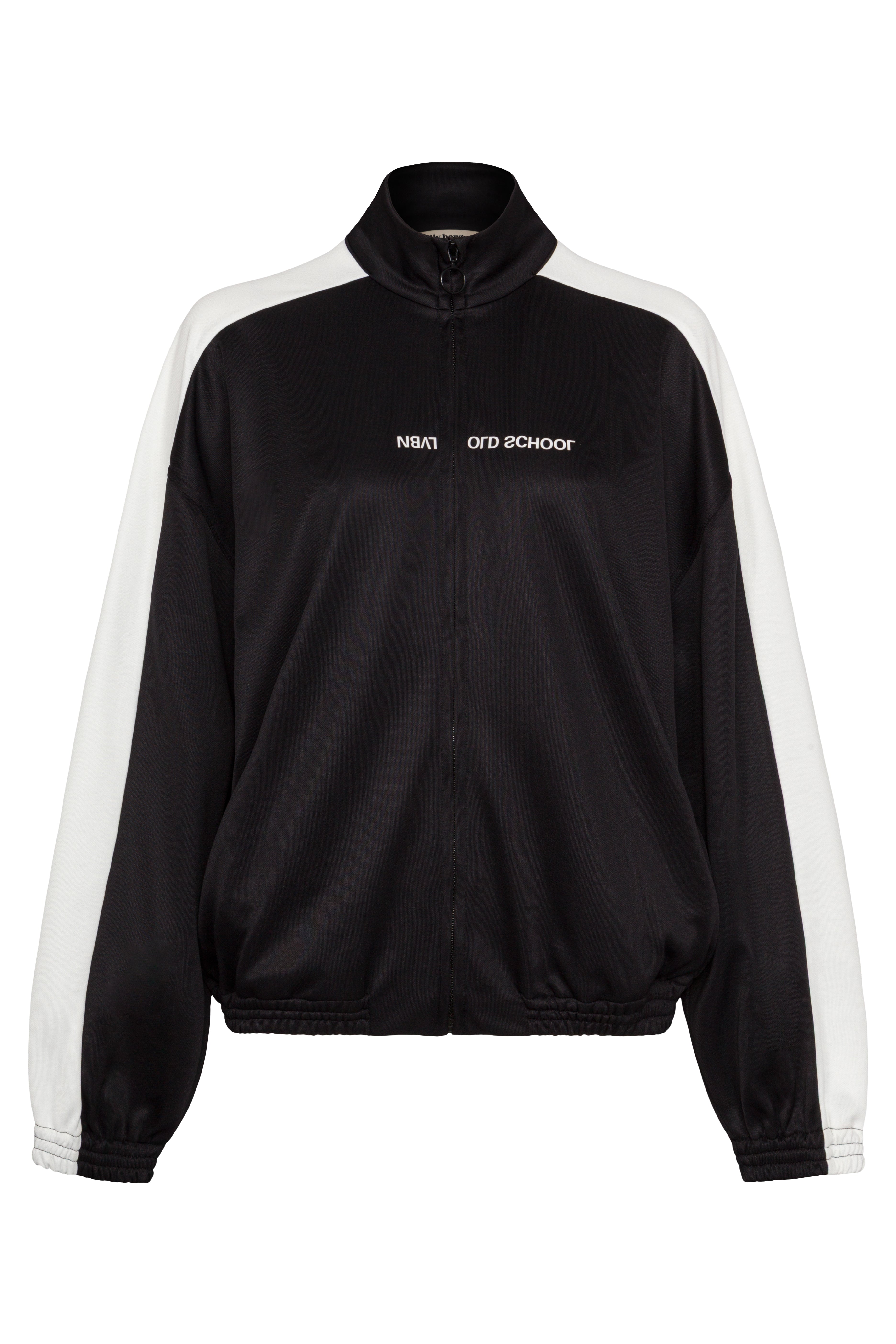 Sportlich-elegante Track Jacke in schwarz mit kontrastierendem weißen Streifen am Ärmel. Der markante Schriftzug auf der Brust verleiht dem Design eine moderne Note. Perfekt für den urbanen Alltag oder sportliche Aktivitäten, kombiniert die Jacke Funktionalität mit zeitgemäßem Stil.