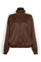 Sportlich-elegante Track Jacke in dunkelbraun mit kontrastierendem weißen Streifen am Ärmel. Der markante Schriftzug auf der Brust verleiht dem Design eine moderne Note. Perfekt für den urbanen Alltag oder sportliche Aktivitäten, kombiniert die Jacke Funktionalität mit zeitgemäßem Stil.