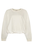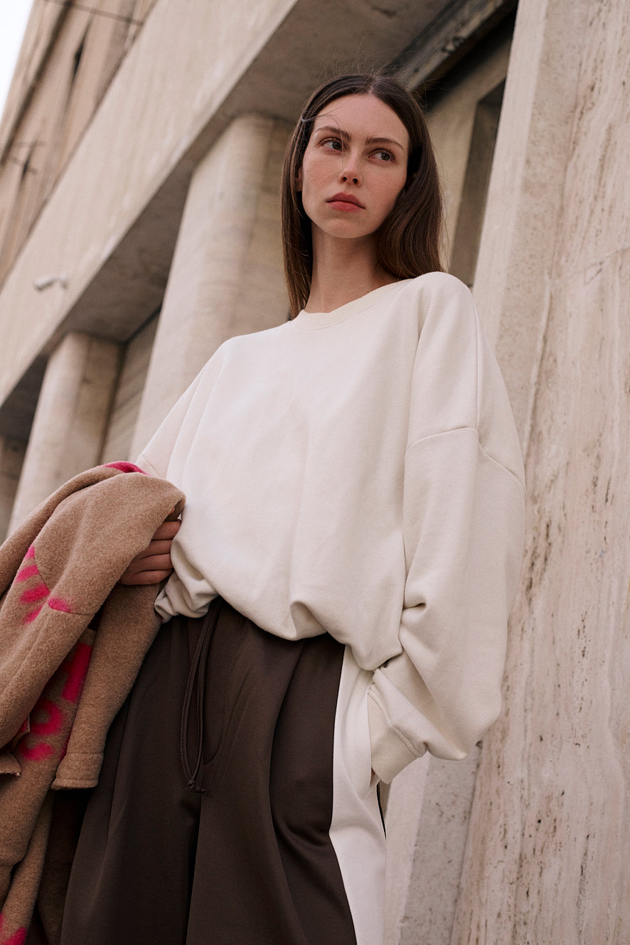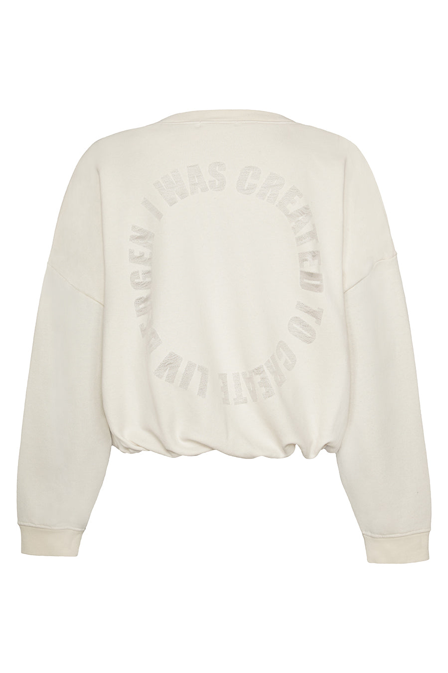 Dieser Offwhite-Sweater überrascht mit verspielten Falten am Saum und einem kreativen Ausbrenner Print auf der Rückseite. Ein echter Hingucker mit Persönlichkeit – für alle, die ihrem Outfit eine frische, individuelle Note verpassen wollen.