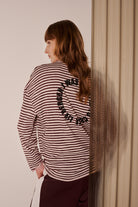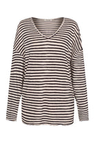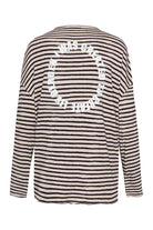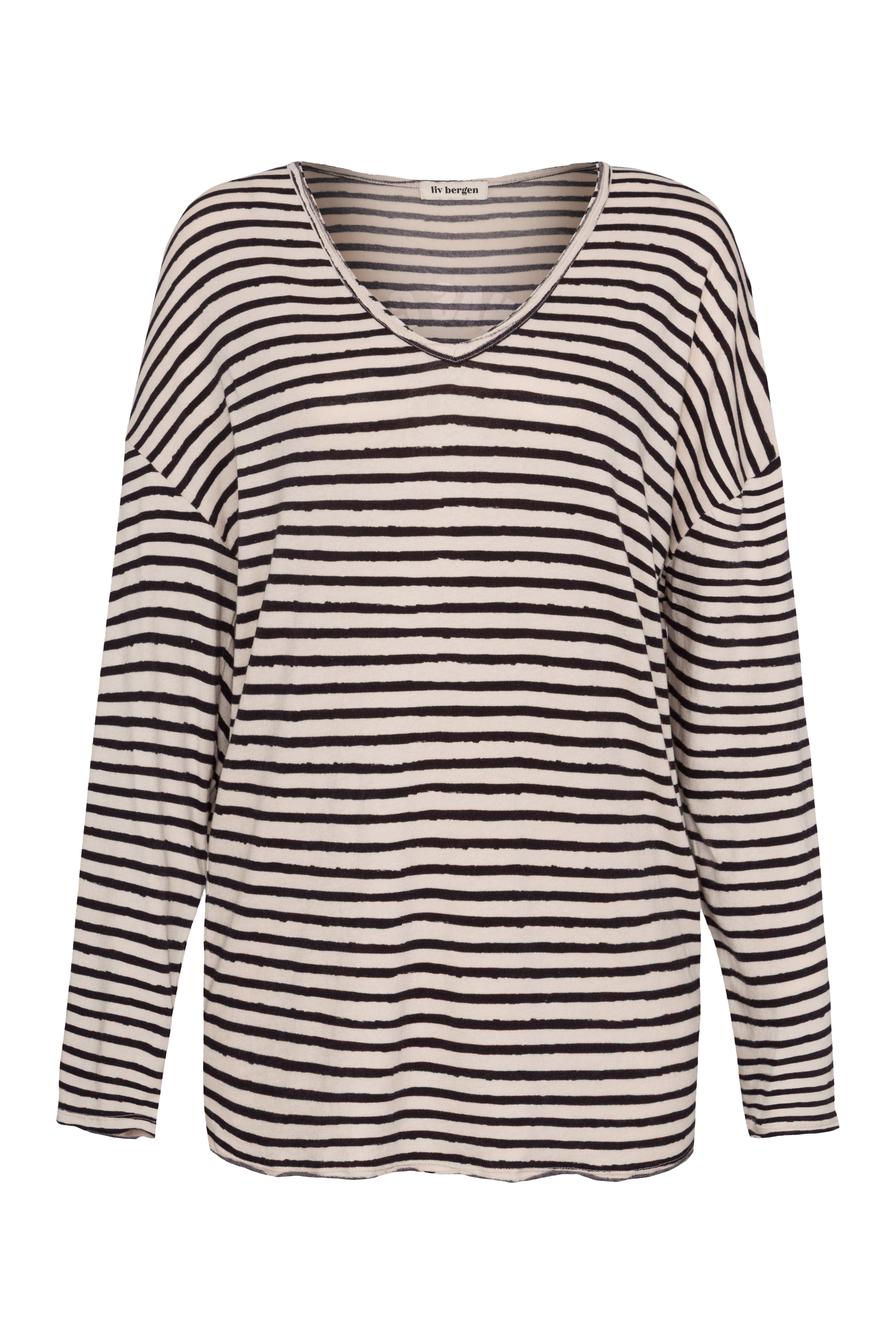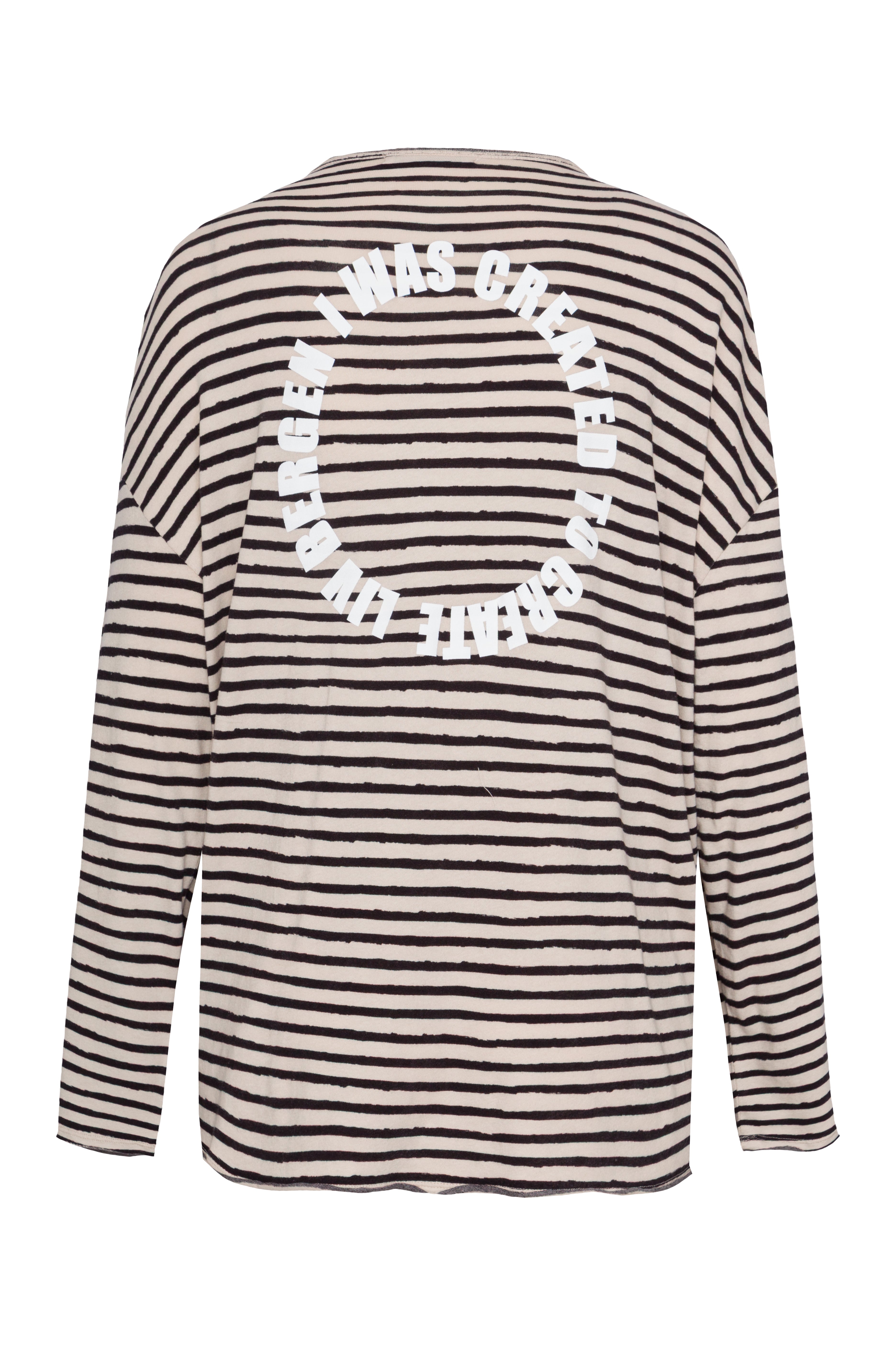 Dieses gestreifte V-Neck-Shirt bringt mit seinen unregelmäßigen schwarzen Streifen sofort gute Laune. Auf der Rückseite setzt der Print „I was created to create liv bergen“ ein kreatives Statement – ideal für Looks mit Persönlichkeit und Farbe.